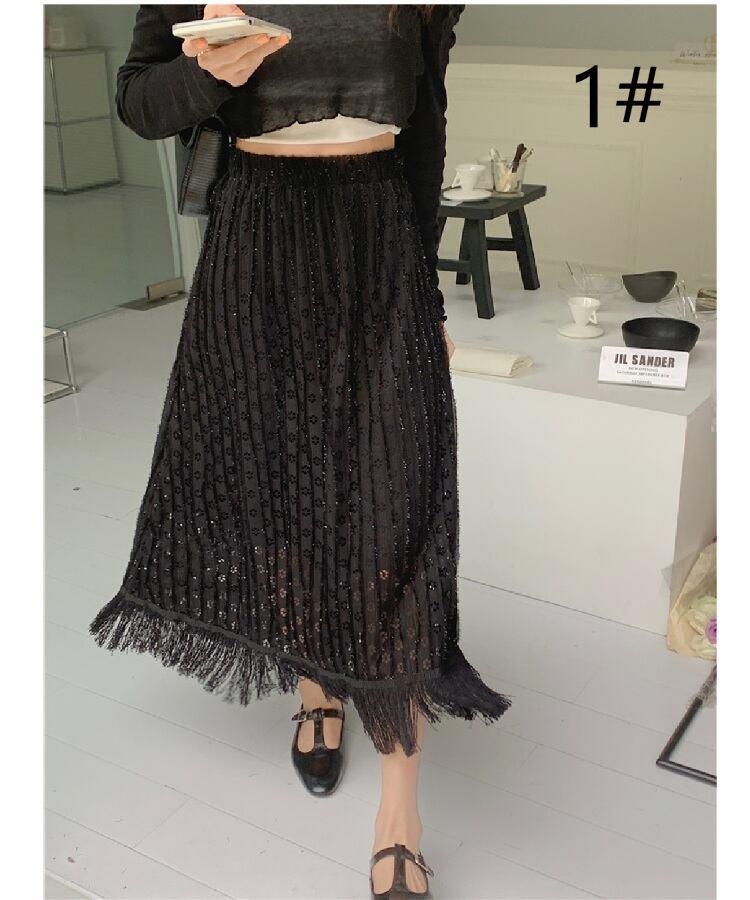 ロマンティックな雰囲気漂う、エレガントなレーススカートが登場しました。フェミニンな印象を与えるロング丈と、ハイウエストデザインで、美しいシルエットを演出します。さらに、フリンジディテールがスカートの動きを引き立て、上品な揺れ感を演出します。幅広いスタイルに合わせやすいカラーバリエーションも魅力の一つです。オフィスシーンからデートまで、様々な場面で活躍してくれること間違いなしです。