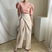ハイウエストのロング丈ワイドパンツ。足元をすっきり見せてくれるだけでなく、ウエストのリボンデザインが上品な印象を与えます。さらに、脚を長く見せてくれる効果も期待できる一点です。モデルのようなスタイルアップが叶うこと間違いなしです。