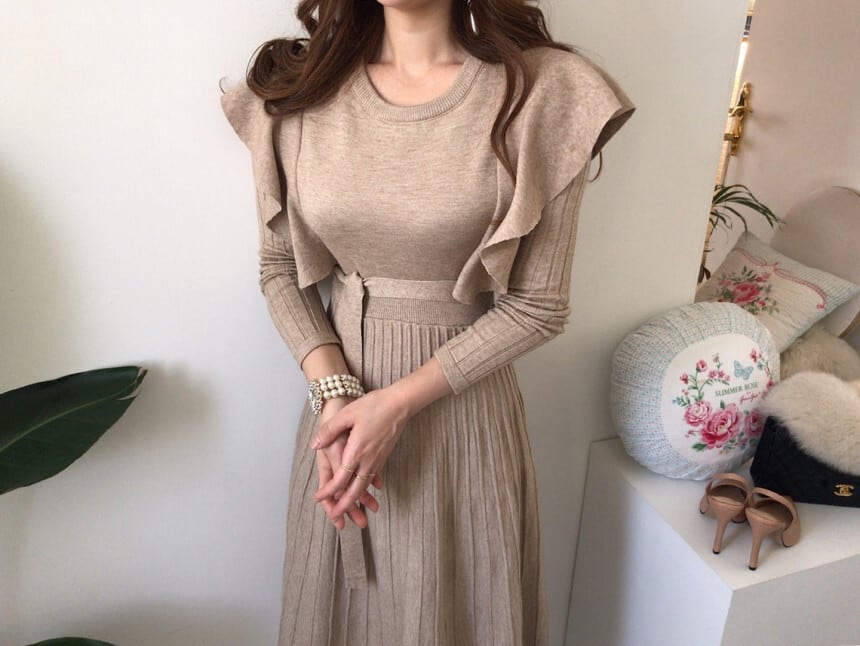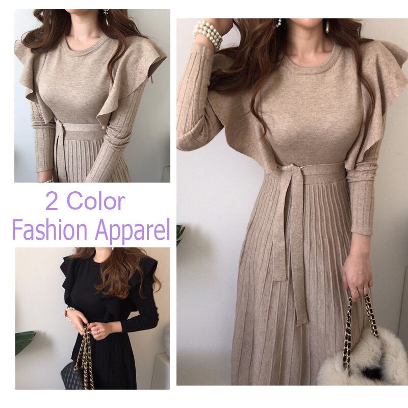 女性らしさを引き立てるニットワンピース。上品で女性らしいデザインのロングワンピースです。韓国風のフレアシルエットが、華やかで女性らしい印象を与えます。柔らかい素材感で肌触りも良く、着心地も抜群です。まろやかな色合いが、女性の優しさを引き立てます。カジュアルな場でも、おしゃれな場でも活躍する一枚です。暖かみのあるニット素材で、秋冬の装いにぴったりです。