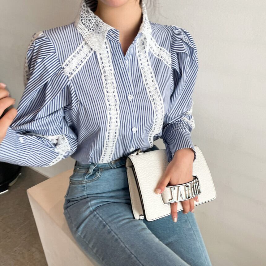 柔らかな素材で作られたレースブラウス。上品なストライプ柄とレースの組み合わせが、大人可愛い印象を与えます。洗練されたデザインでありながら、着るだけでスタイルが華やかに見え、さらに着痩せ効果も期待できます。