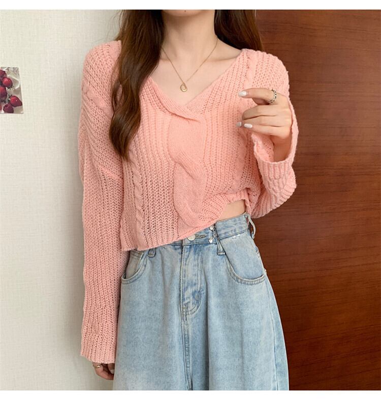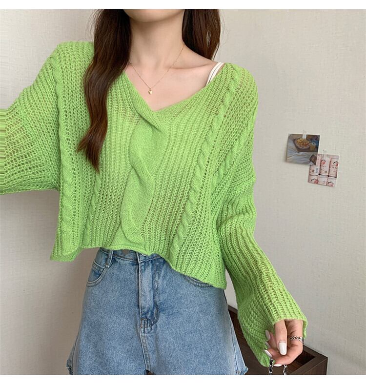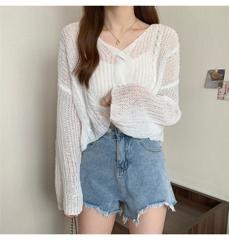 Vネック セーター ニットトップス レディース 薄い ゆったりする 透かし彫り デザインセンス トップス