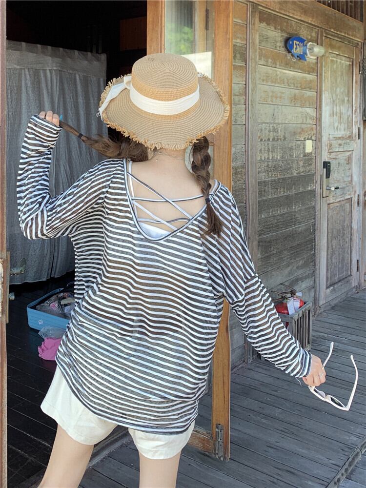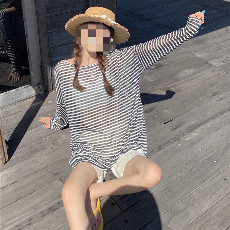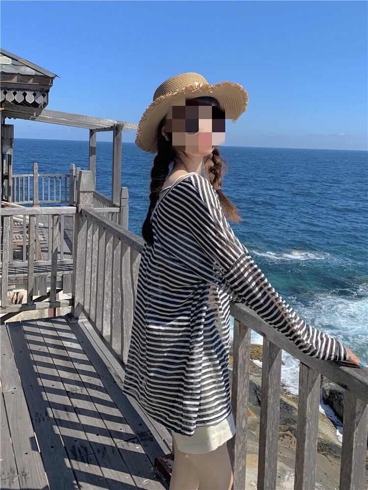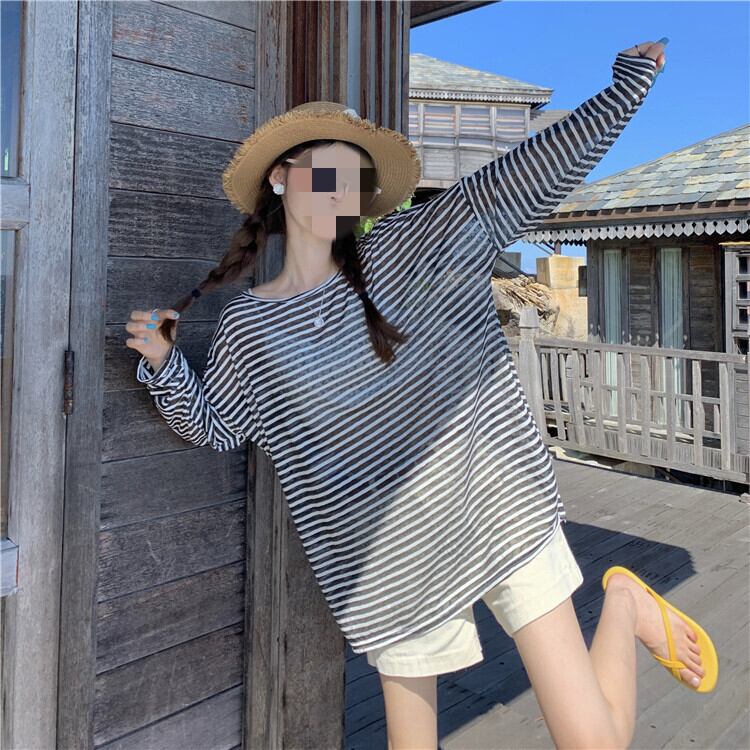 しっかりと日差しを遮りながらもおしゃれに着こなせる、韓国のボーダー長袖トップスです。UVカット効果の高い日焼け止めウェアとしても活躍する一枚。さりげないボーダーデザインが、カジュアルながらも女性らしい雰囲気を演出します。