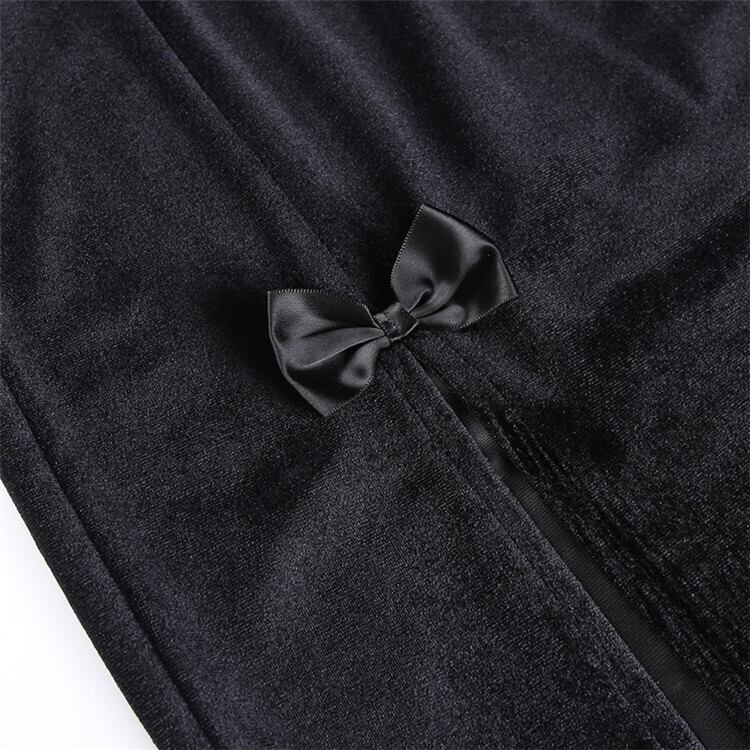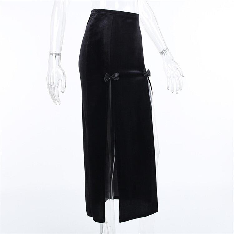 エレガントな印象を与えるロングスカートです。ハイウエストのデザインがスタイルをより引き締め、スリムなシルエットが美脚効果を演出します。蝶結びのアクセントが女性らしさをアップさせ、裾にはスプリットが入っているため、歩くたびに美しい足元を演出します。