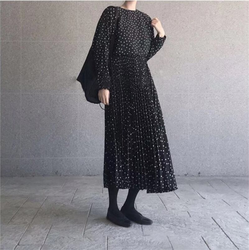 水玉柄 ワンピース ロング丈ワンピ プリーツ レディース 体型カバー 着回し