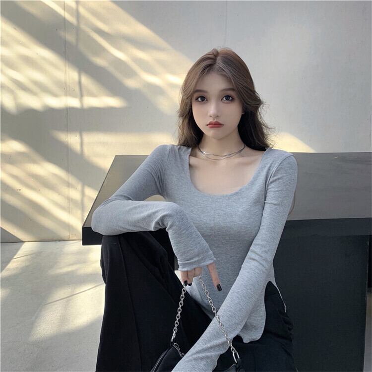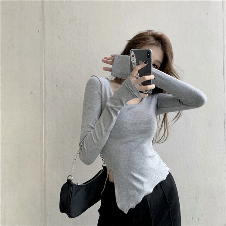 長袖 スリムフィット スプリット ニット 短いスタイル Tシャツ トップス レディース
