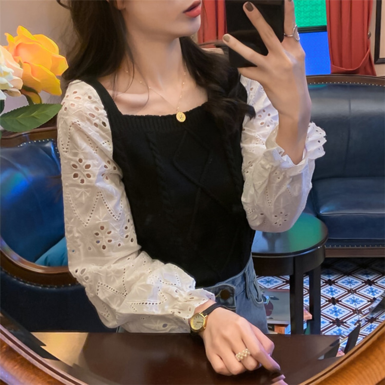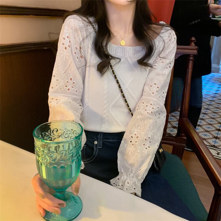 縫付 スクエアネック パフスリーブ ニットトップス レディース