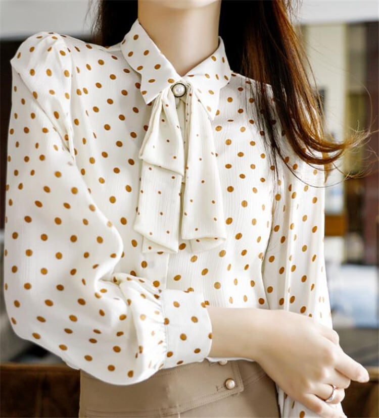 気品漂う雰囲気を醸し出すINSスタイルのドットシフォンシャツ。職場でのコーディネートにもぴったりで、上品な印象を与えます。蝶結びのデザインが、華やかさをプラス。おしゃれで女性らしいスタイルを演出します。