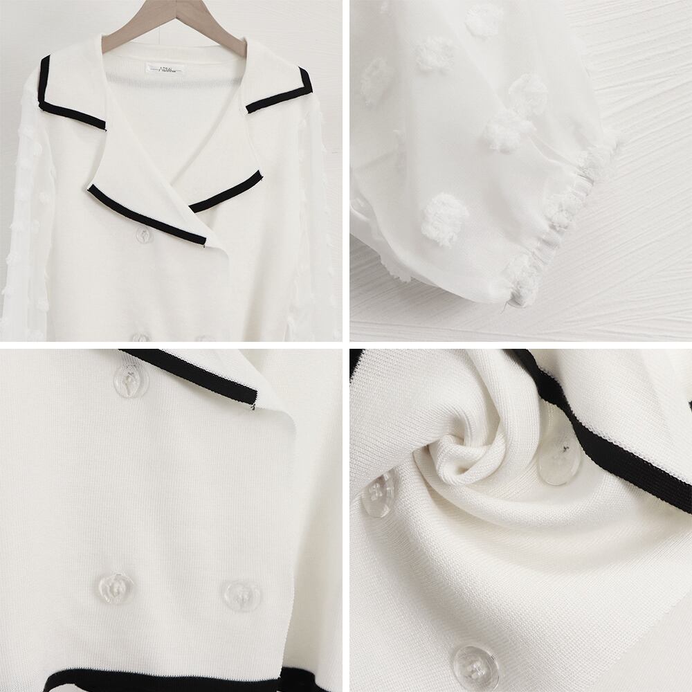 Vネック ニットブラウス ダブルブレスト 袖切り替え おしゃれニットトップス オフィスカジュアル 大人可愛い 韓国春秋夏