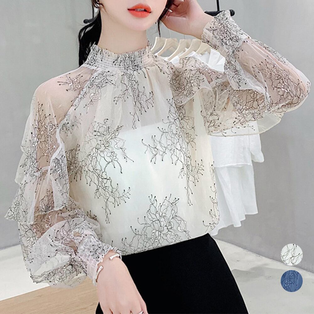 フリル フレアトップス 透け感 肌見せ 大人可愛い花柄ブラウス ハイネック ぽわん袖春夏長袖 薄手ブラウス 韓国おしゃれ