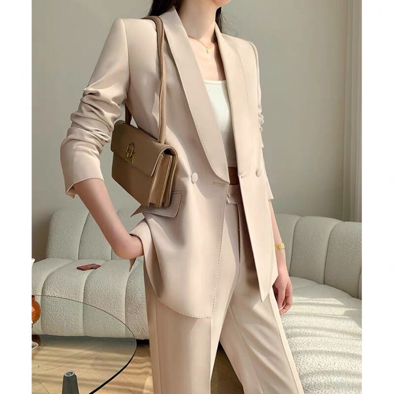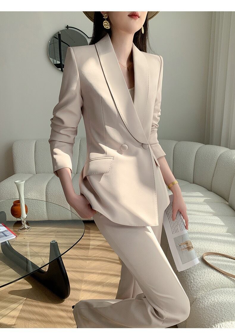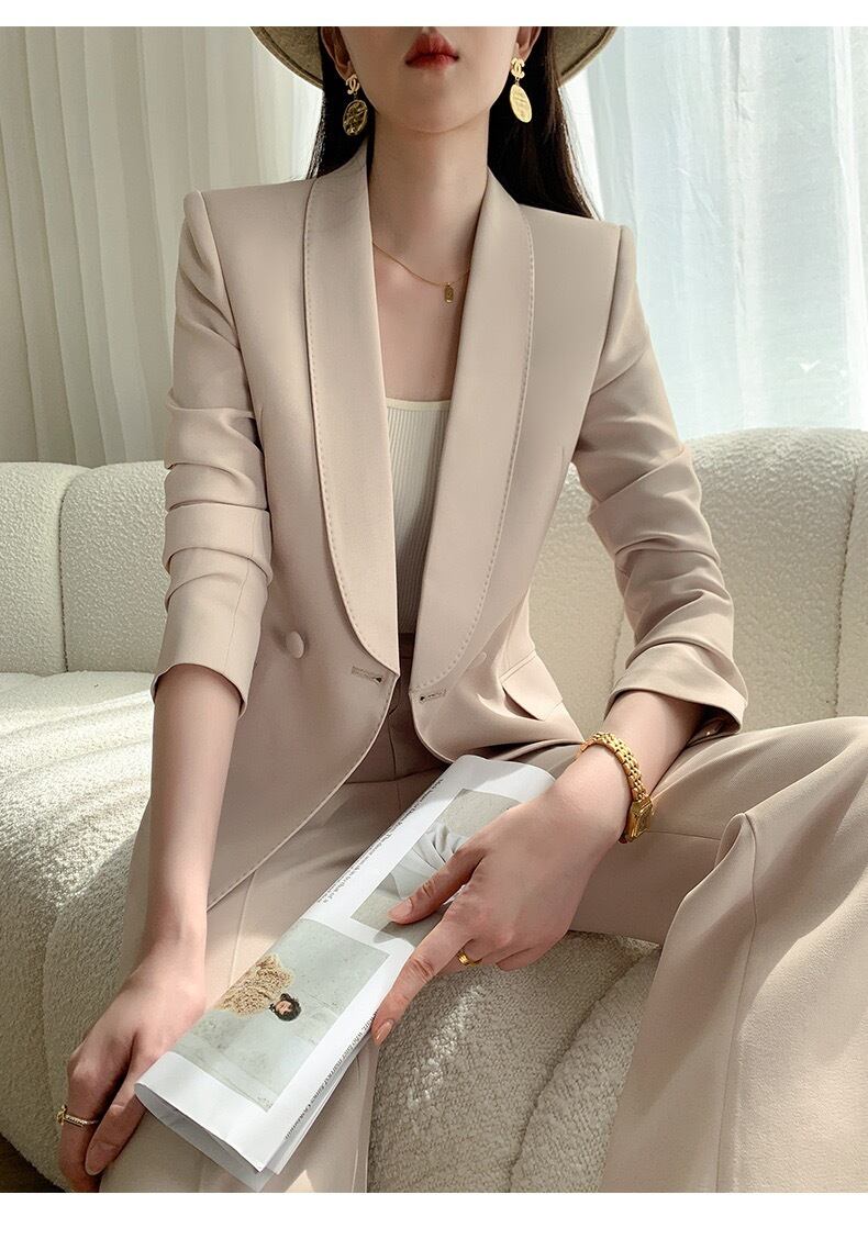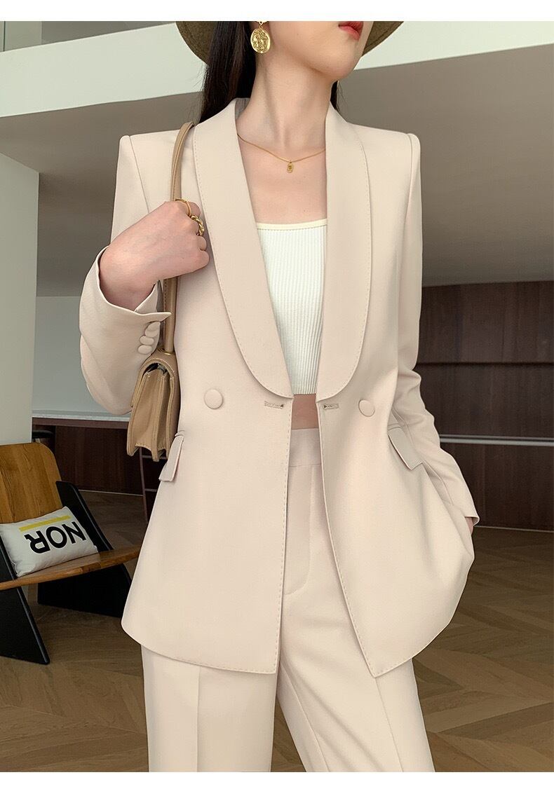 この上品でモダンなスーツセットは、あなたのキャリアウーマンとしての自信を演出します。新しい一週間に自信を持ってスタートできるように、このセットを是非取り入れてみてください。