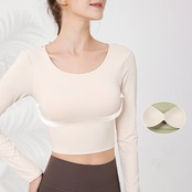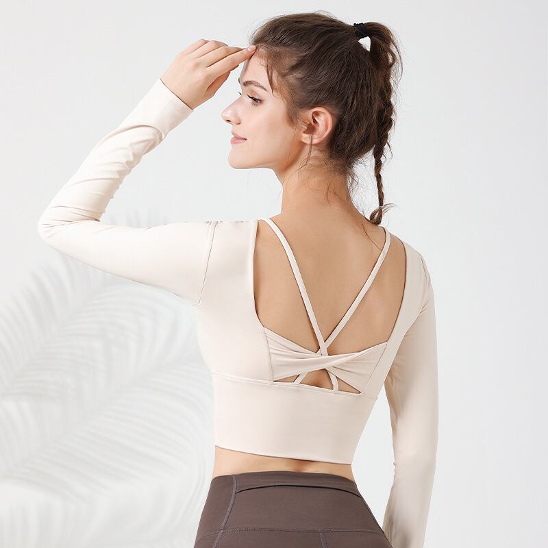 ダンスやヨガなどのスポーツシーンに最適なカジュアルブラウス。長袖で動きやすく、スポーティなデザインが魅力。