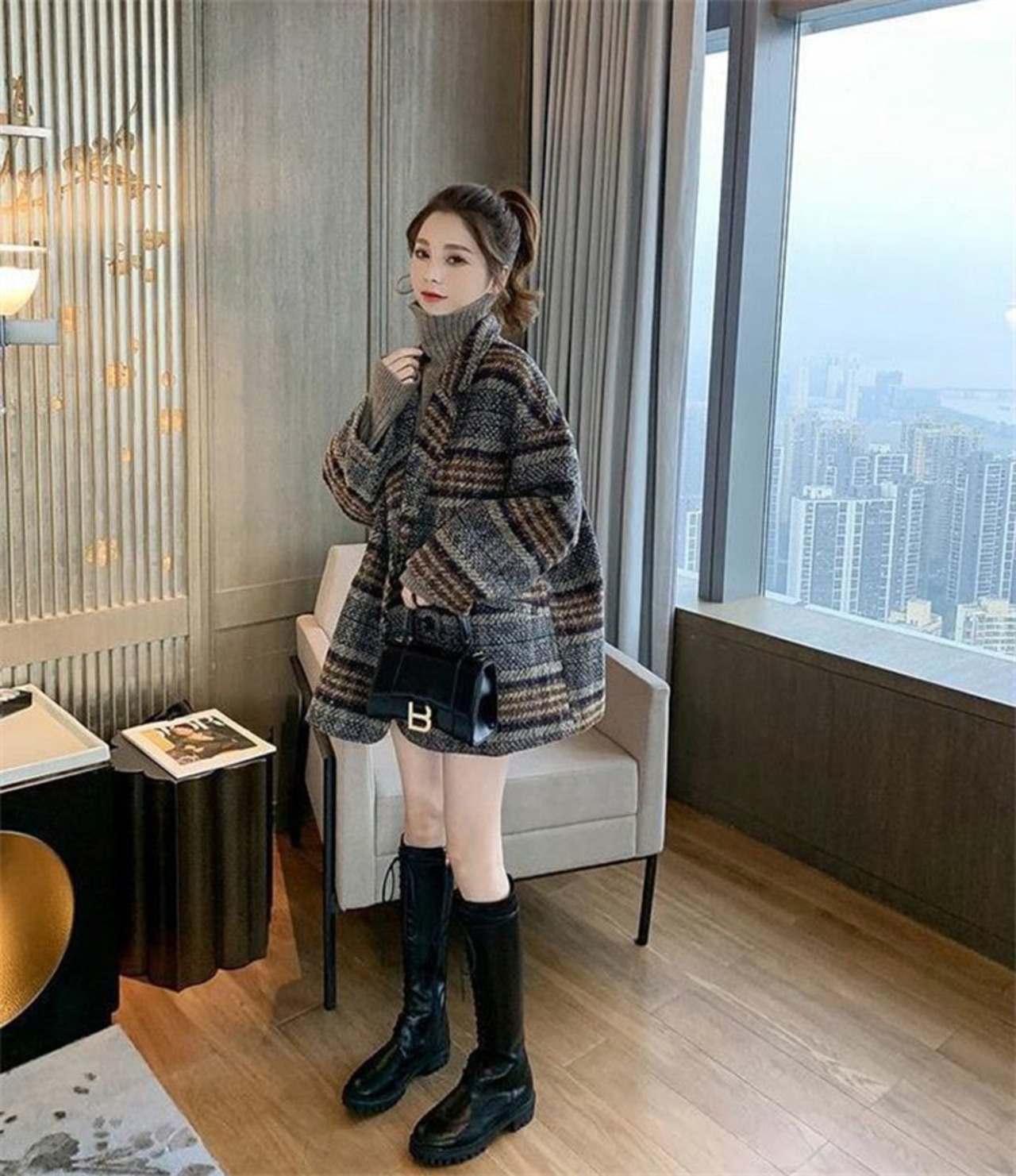 ゆったりする スーツ 格子縞 スリム ツイード 中長セクション ツイードコート スリム
